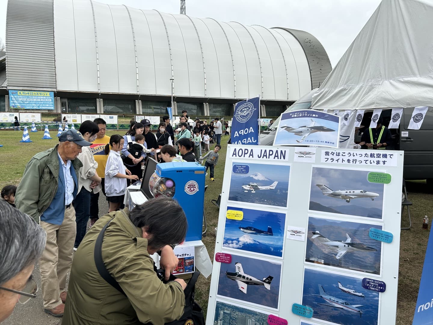 特にAOPAブースは会員参加者により個人負担で準備された展示物等がブースに立ち止まる人を引き付け、極め付きは13時30分から開始された佐久間哲也理事によるHONDA JETボランティアによる上空デモ飛行には、全入場者が空を仰ぎ見る、壮観な会場風景でした。