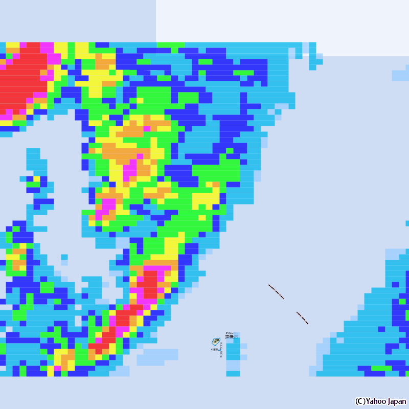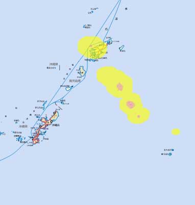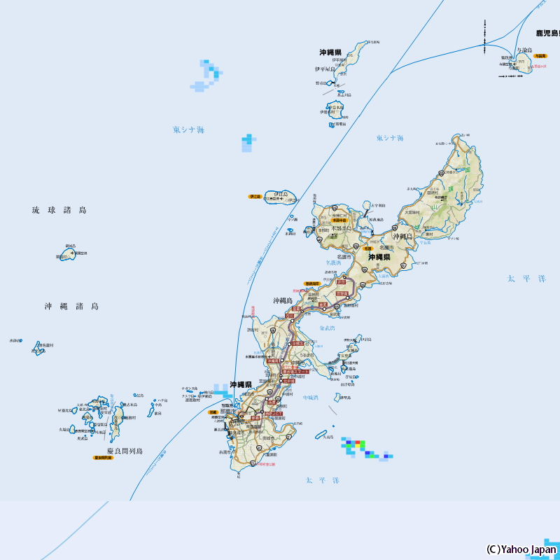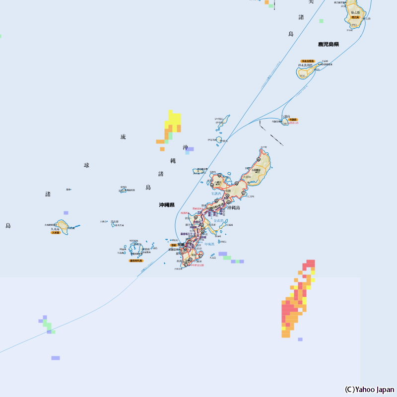 那覇の東海上 久高島東に僅かな赤色の強雨域が確認できる