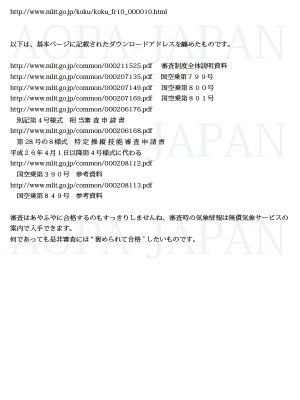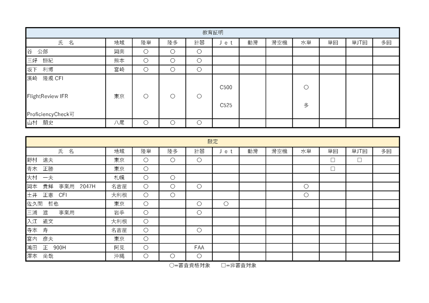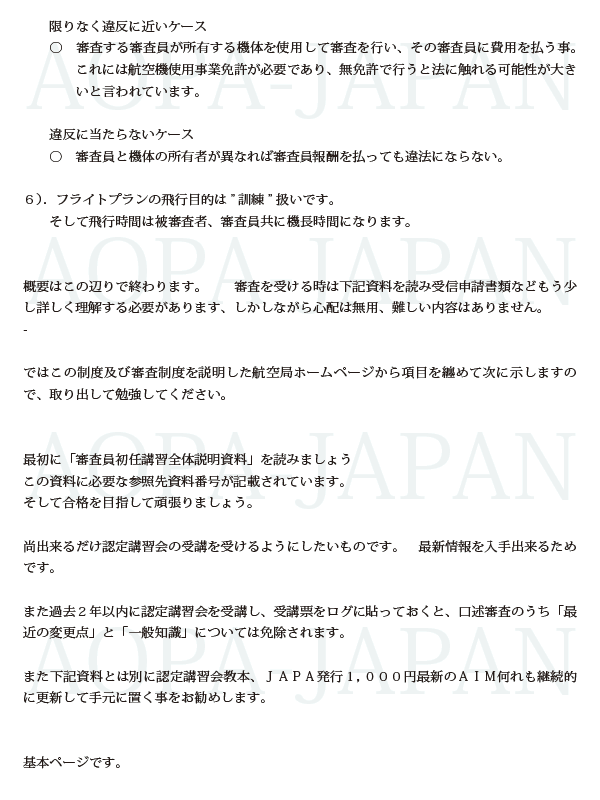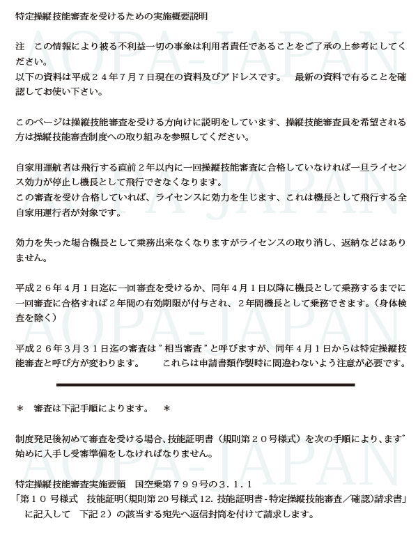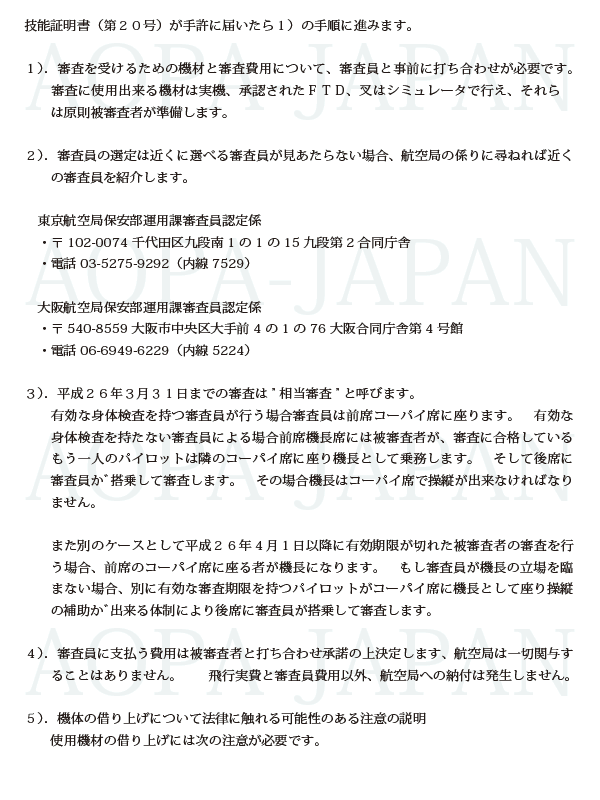 3.平成26年4月以降に最初の審査を受ける場合、もしくは当該年月以降に期限を切らして審査を受ける場合、出来る限り教育証明所有の審査員を選ばれることを推奨します。 これは受験者が機長として飛行することが出来ないため、飛行の責任がその飛行の機長となる審査員若しくは有効な資格を持つ同乗者となり、責任の承諾を得る必要を生じるためです。