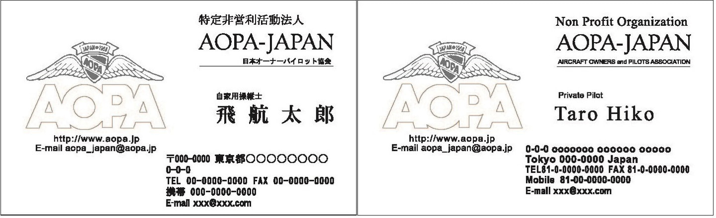 AOPA-JAPANの名刺は会員の方ならどなたでも作ることができますので、ご入用の方は事務局にお申し込みください。